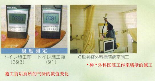 答:室內(nèi)的墻壁、天花板、地毯、家具等涂層施工后,可以除去甲醛、乙醛、香煙以及其它的臭味。24小時、半永久狀態(tài)發(fā)揮功效。出具施工前后的臭味檢查報告書。